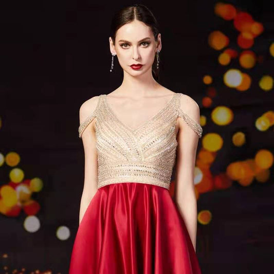 Backless Satin Prom Princess Rhinestone Sweep Ruffle Dress