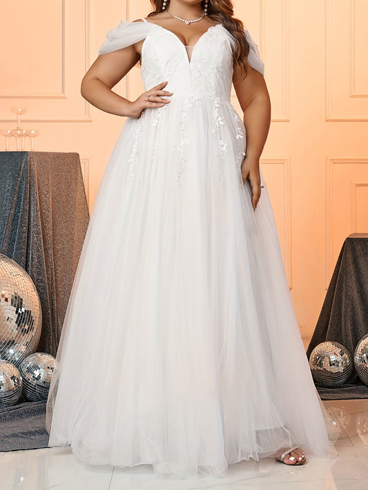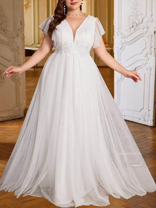 Plus Size Elegant White Wedding Dress, V-Neck Embroidered Mesh Gown with Lace Trim