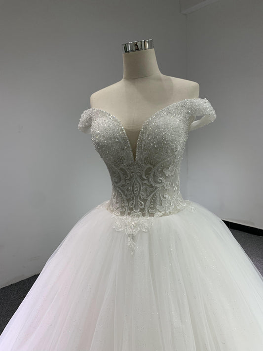 Short Sleeves Full Bead Wedding Grown Dress With Big Tail