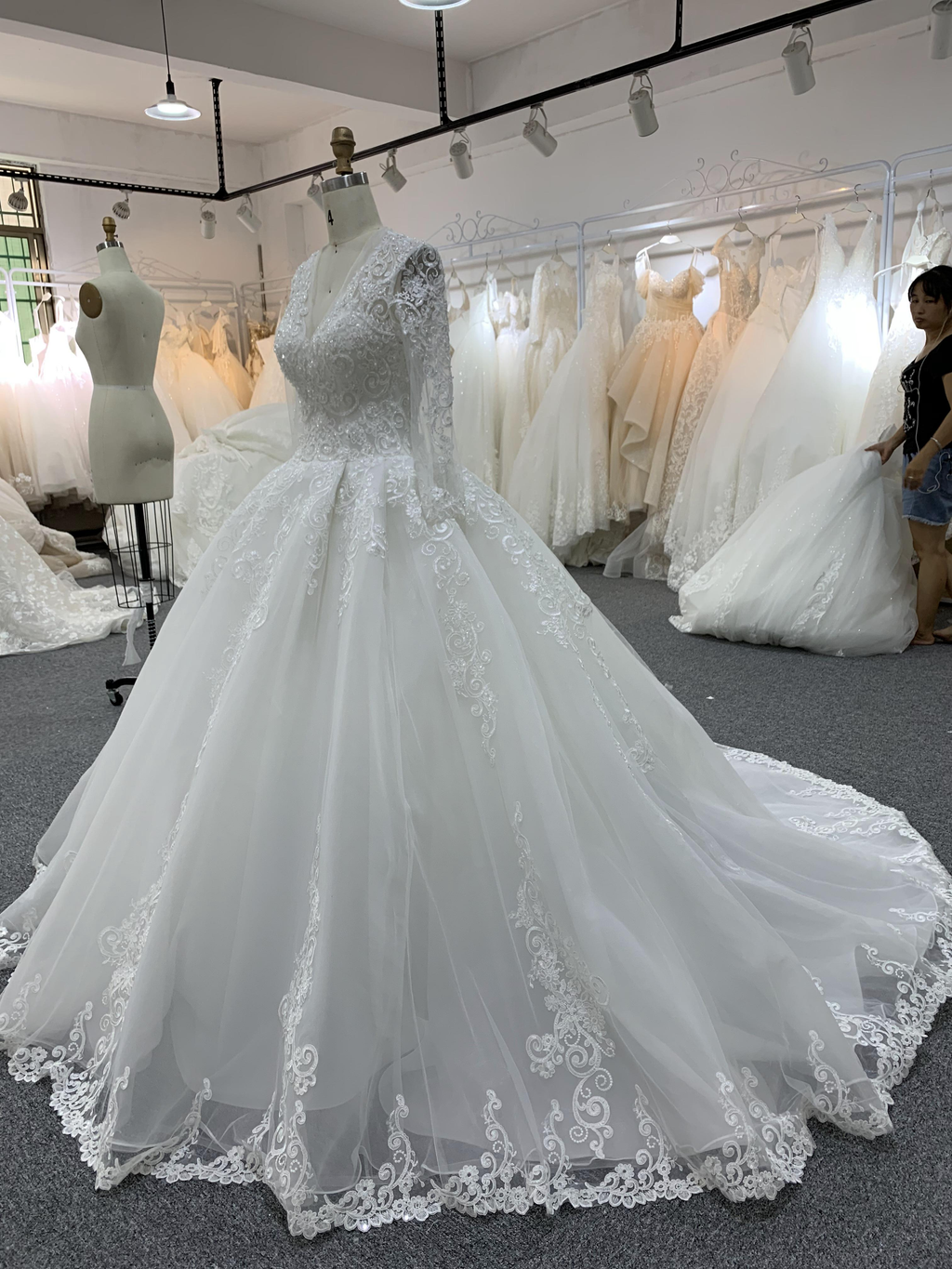 Embrace timeless romance and unparalleled elegance with our exquisite V-neck long sleeve wedding dress. Crafted with delicate lace, this breathtaking ball gown silhouette will make you feel like a true princess on your special day. Featuring a captivating chapel train and a secure lace-up back design, this gown ensures a perfect fit and a stunning bridal look.